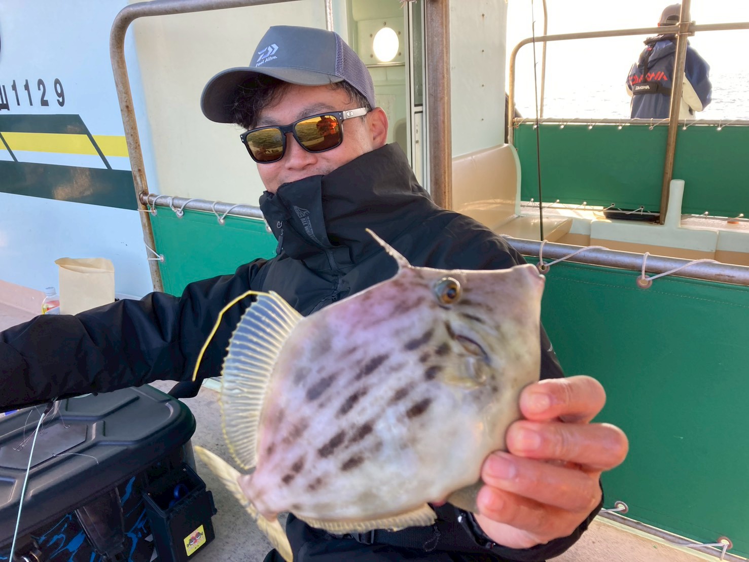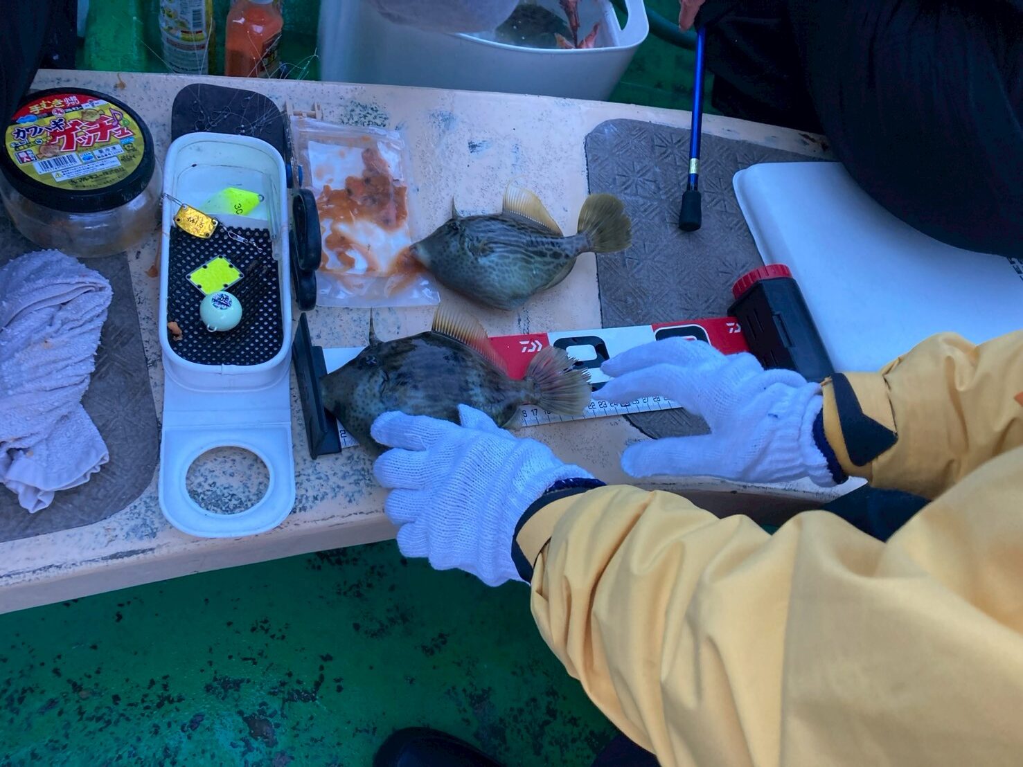 2艘に分かれて2匹のカワハギの長さの合計で競うこの大会、数釣り賞や飛び賞もあり、ちょっと肌寒い晴天の中での出船となりました。