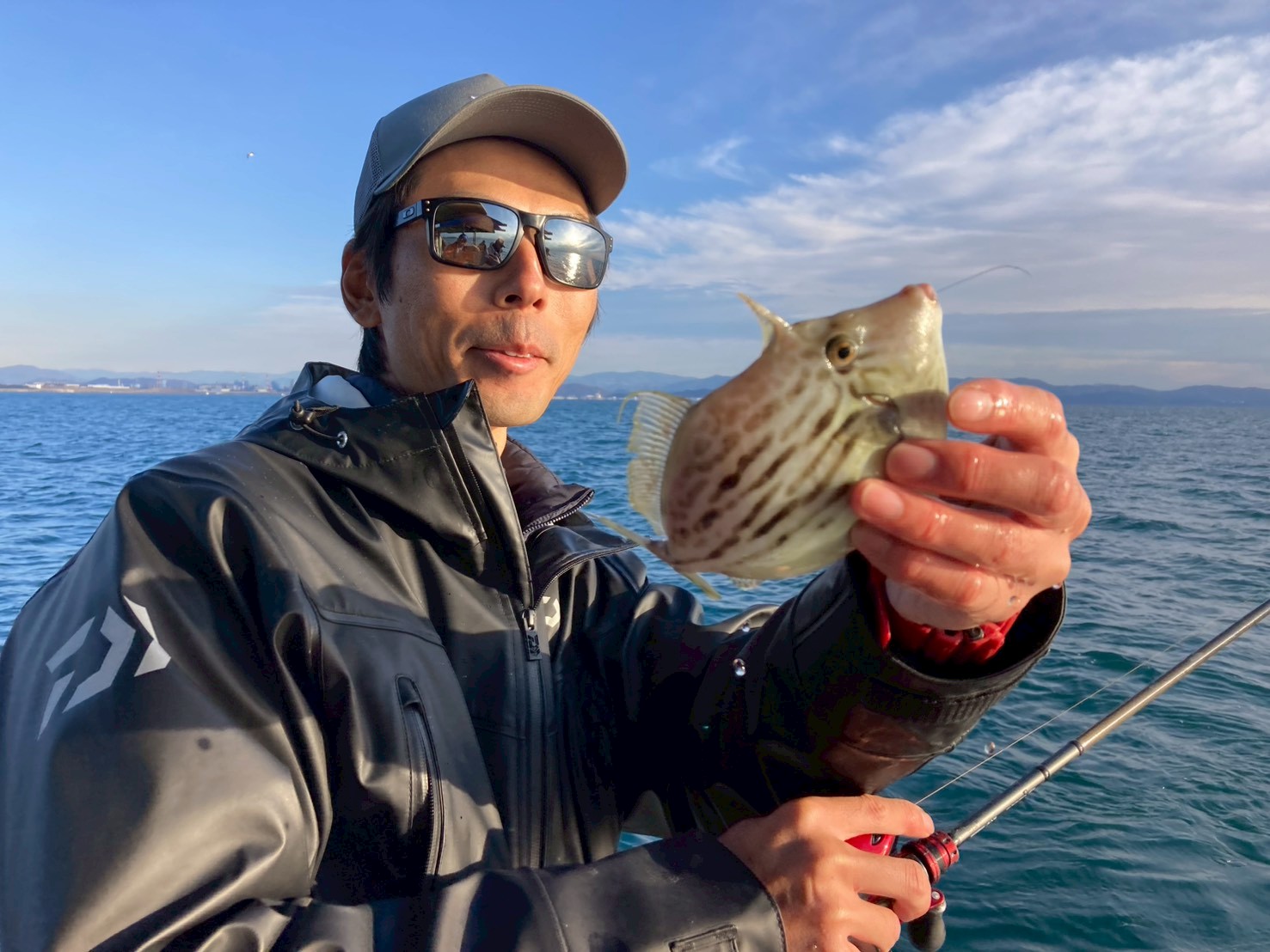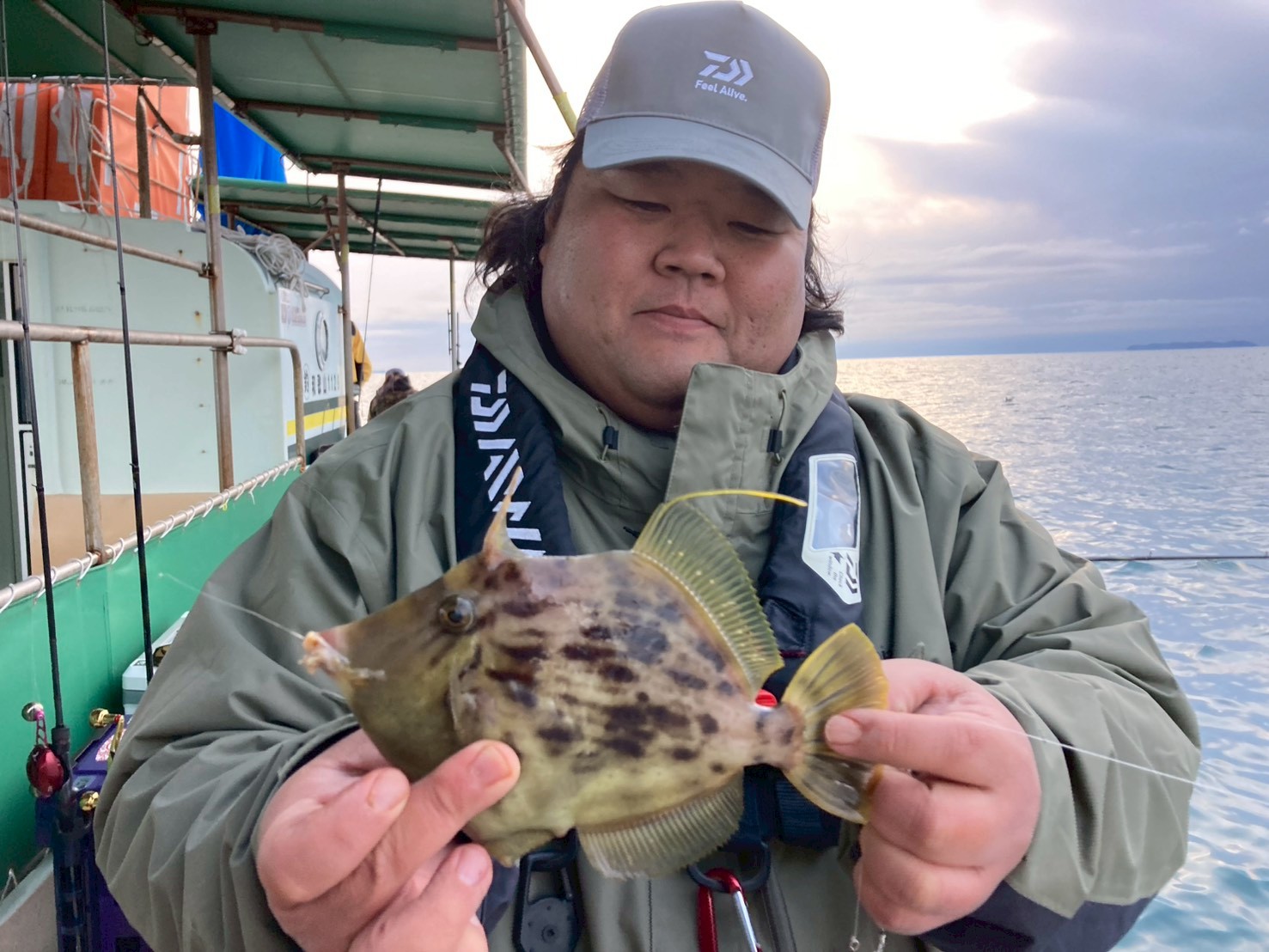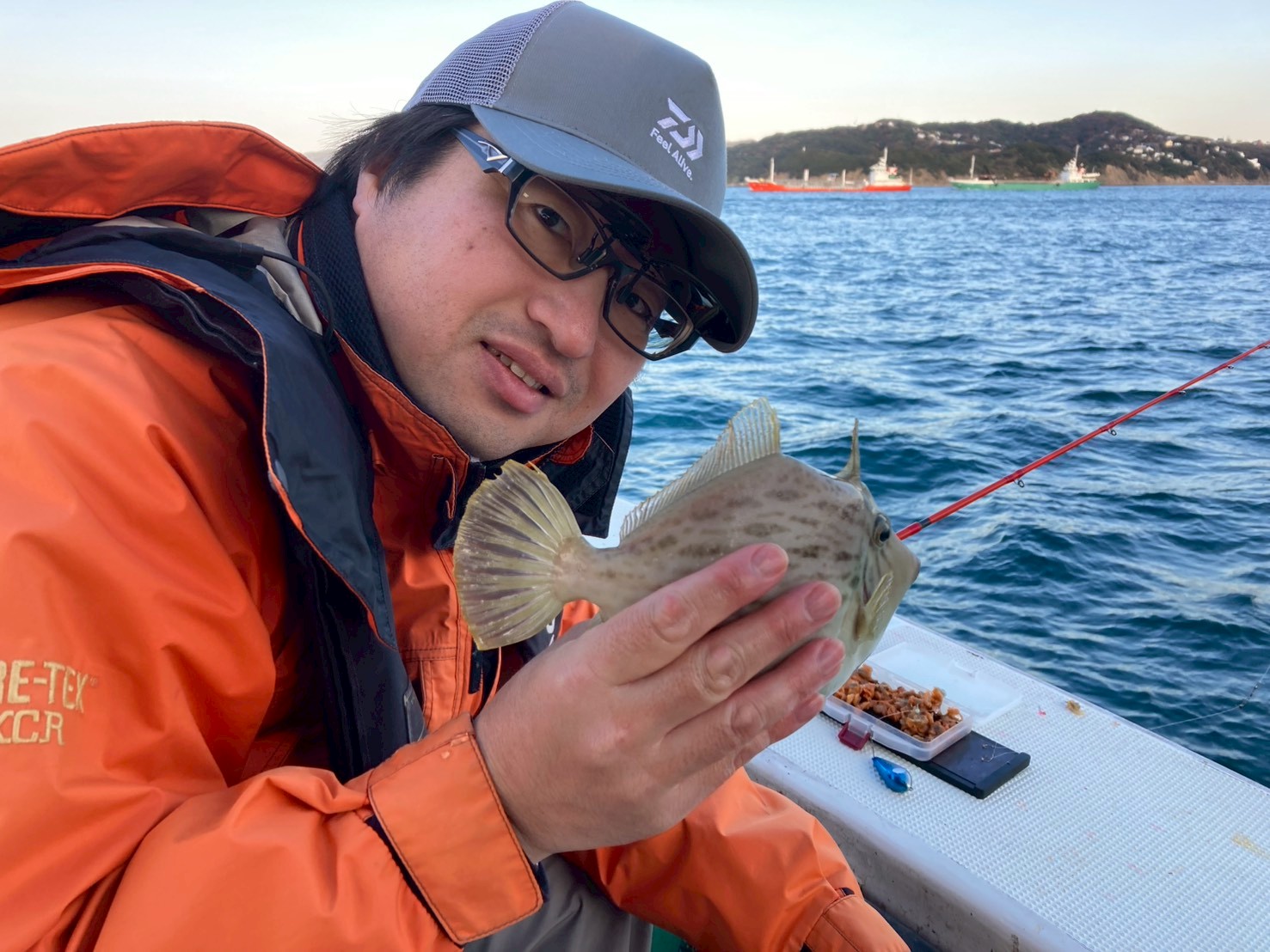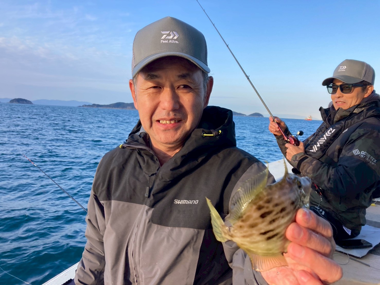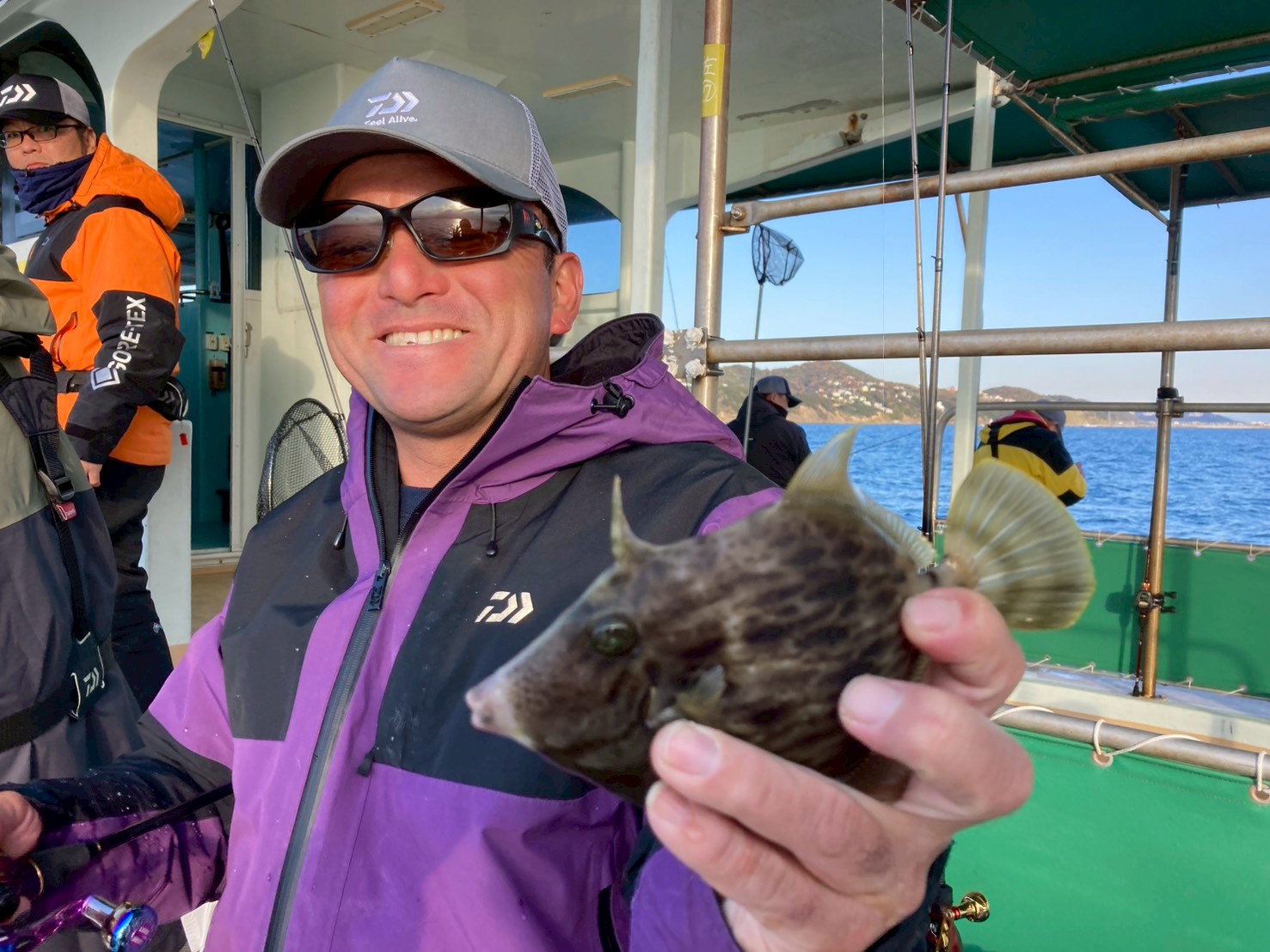 スタートフィシングからしばらくすると、僕らにもロッドを出す機会があり(釣果は船釣果に加算)、清水テスターと共に乗船したヴェルデ(スペイン語で緑の意味だそうで緑色の船体)では、渋いながら清水テスターも僕も小型ながらカワハギを釣り上げホッと胸をなで下ろしたのでした(笑)
