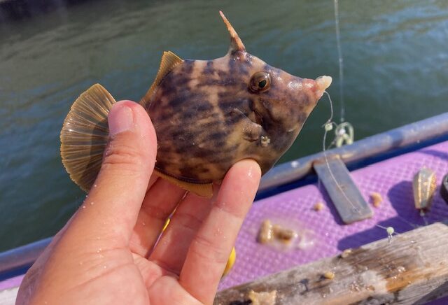 下げ潮止まりの30分前位から段々と潮の流れが落ち着きだし、ベラや、最近多いコモンフグなどのゲストのアタリが頻発し出し、その中のカワハギのアタリを捉えて行きました。