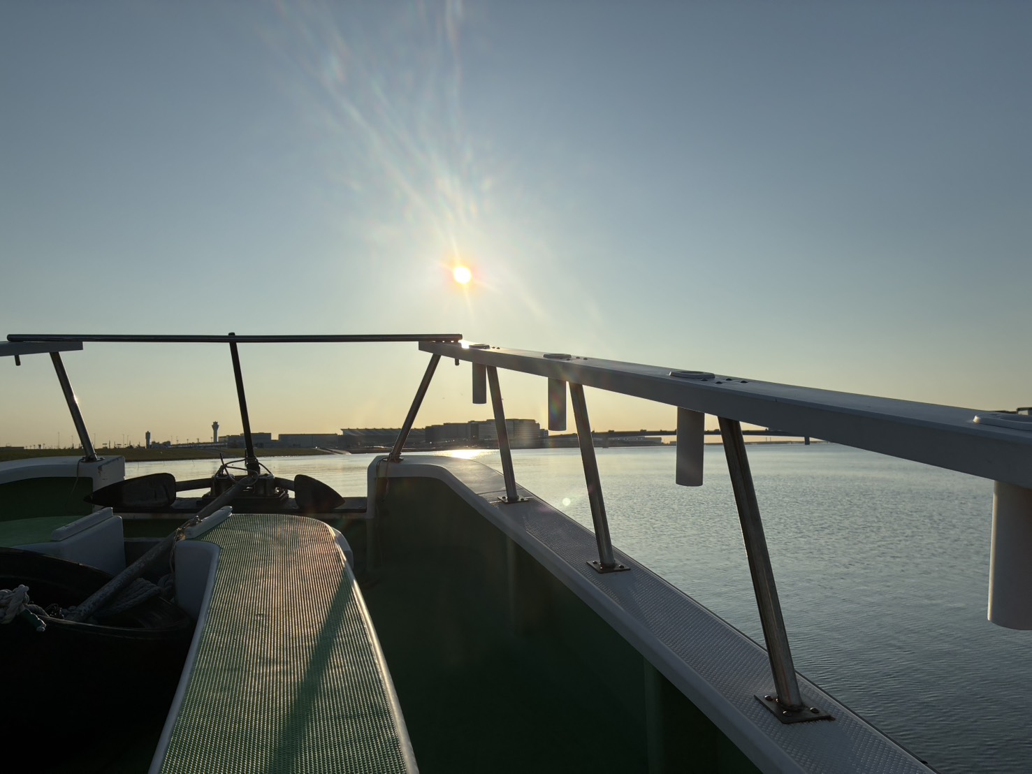 この春は曇りや小雨が多いですが当日は快晴、水面に反射する陽光を観ながらの航行でした。
