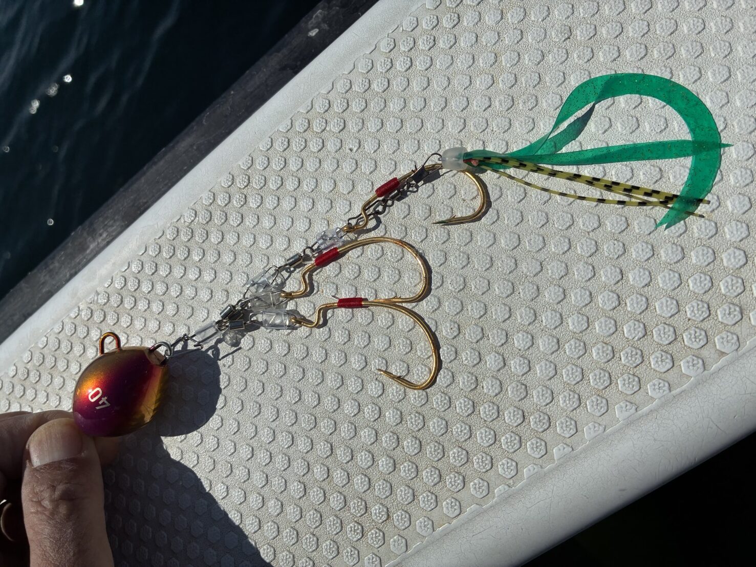 仕掛けが着底してラインを張り、トップガイドを海面から50㎝位の位置にして、そこから2m位、ロッドを立て気味にして仕掛けを浮かせます。