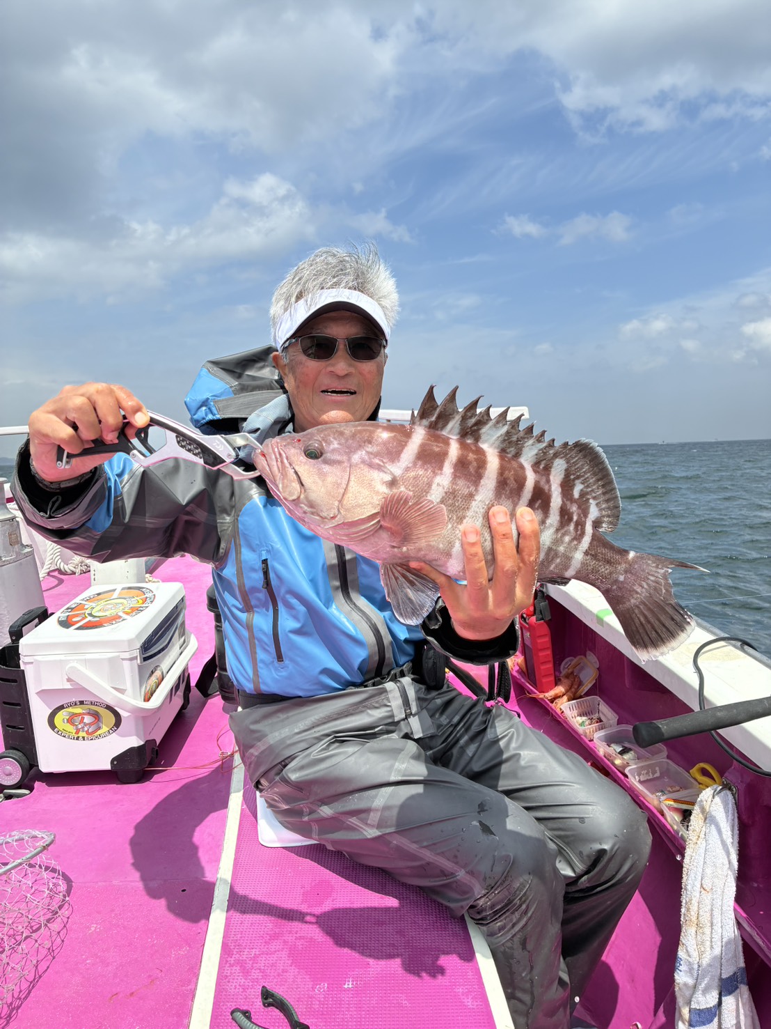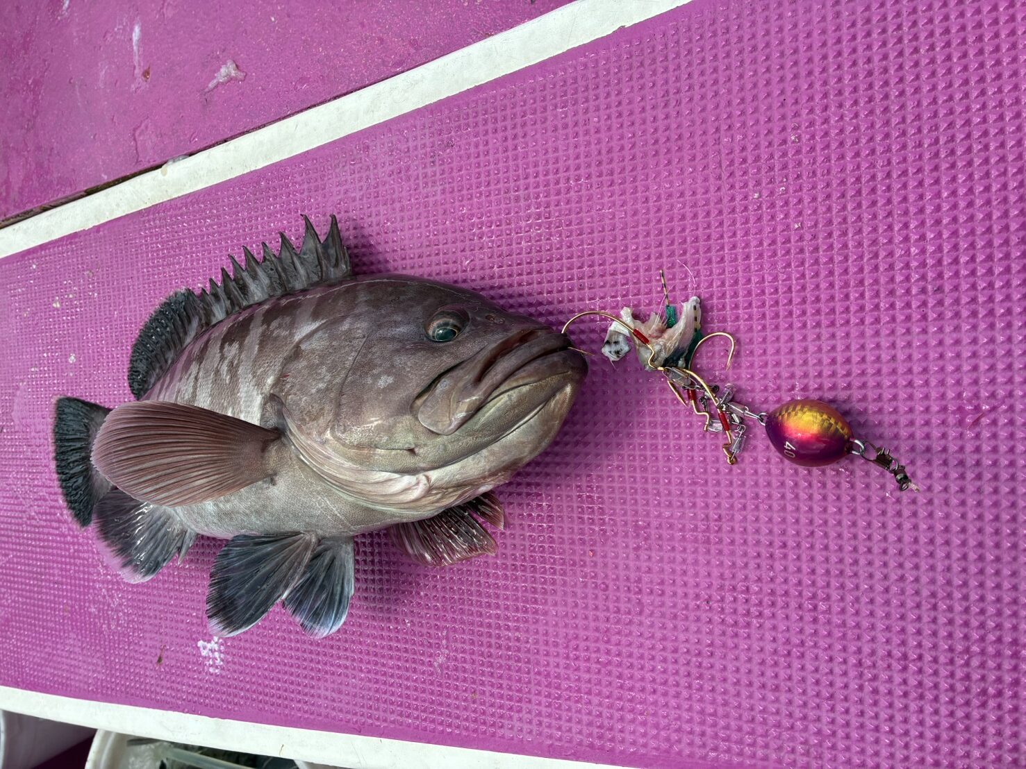 「ちょっとトラフグとは違う引きだなぁ?」と、水面に現れたのは2キロ位のハタでした。