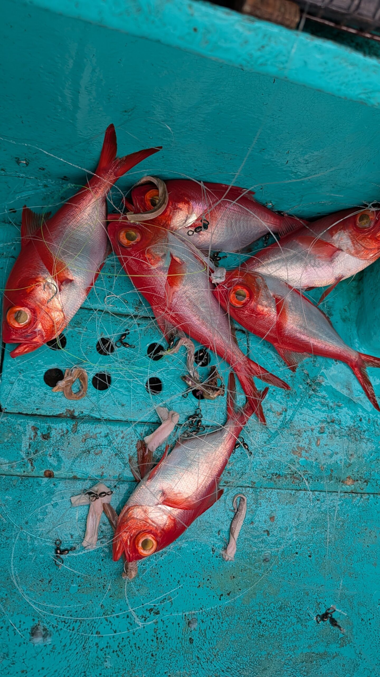 スピードモードに戻し、スピード20で巻き上げてくるとマッドバイパー深海MH-195の竿がバット近くから曲がる程の重量感に加え、ランダムに竿に伝わる魚信に、かなりの多点掛けになっていると確信。