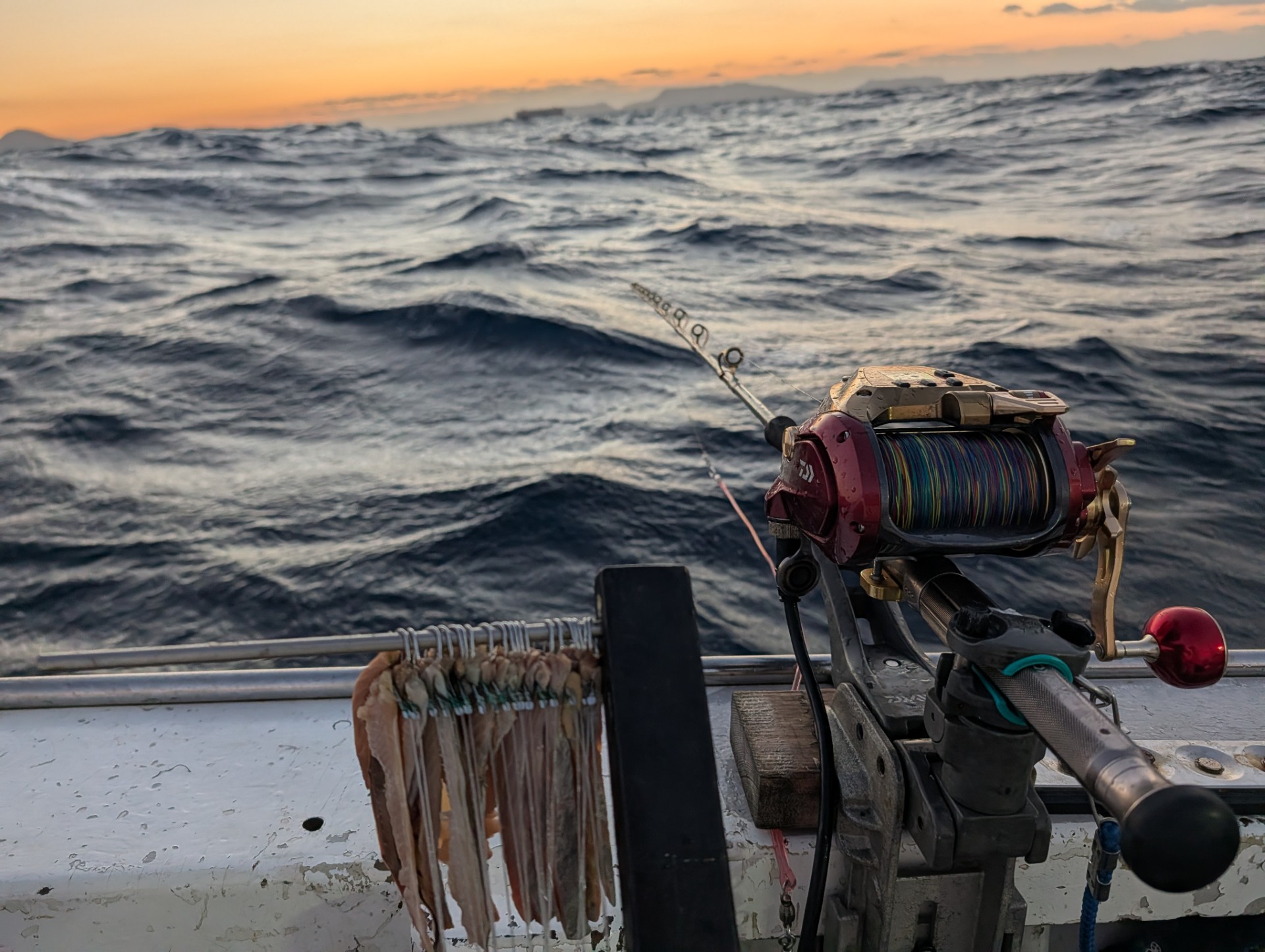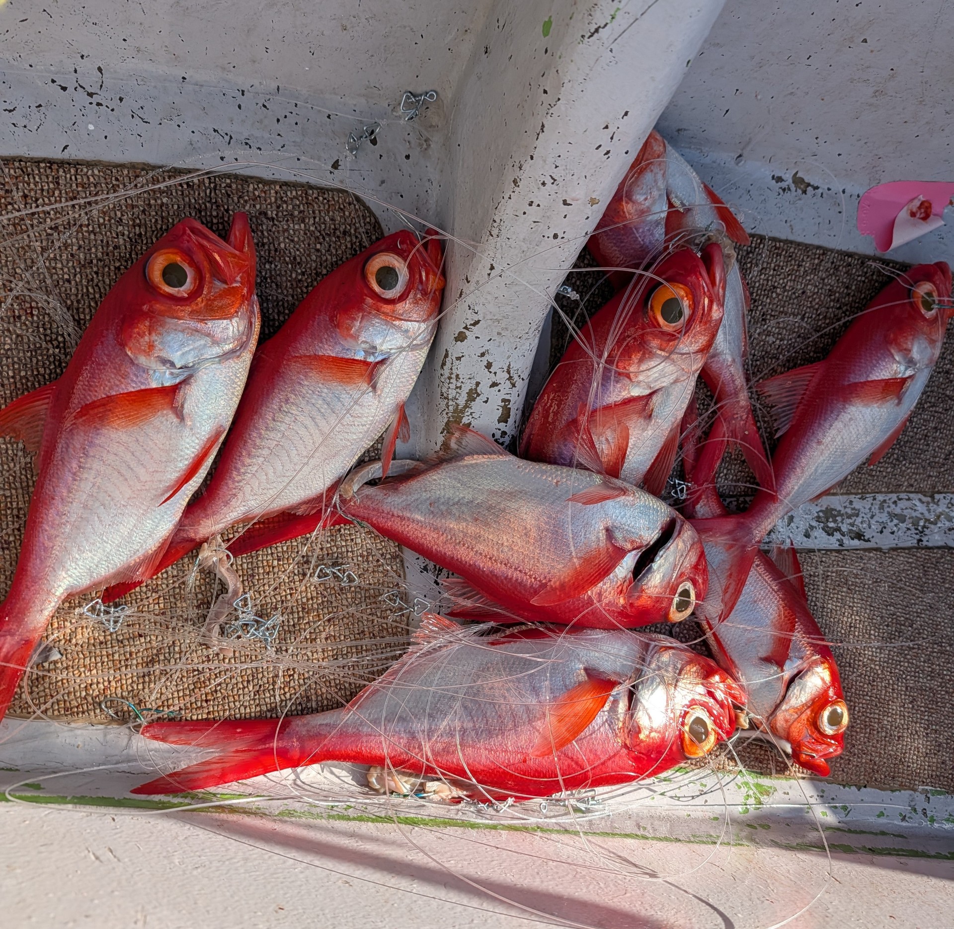 ここのポイントは崖のように掛け上がっている縁にキンメの群れが付いていて、その手前から仕掛けを落としていくので、アタリが有るまではラインを張ったまま待ちます。(オモリが海底をトントン叩く程度で)