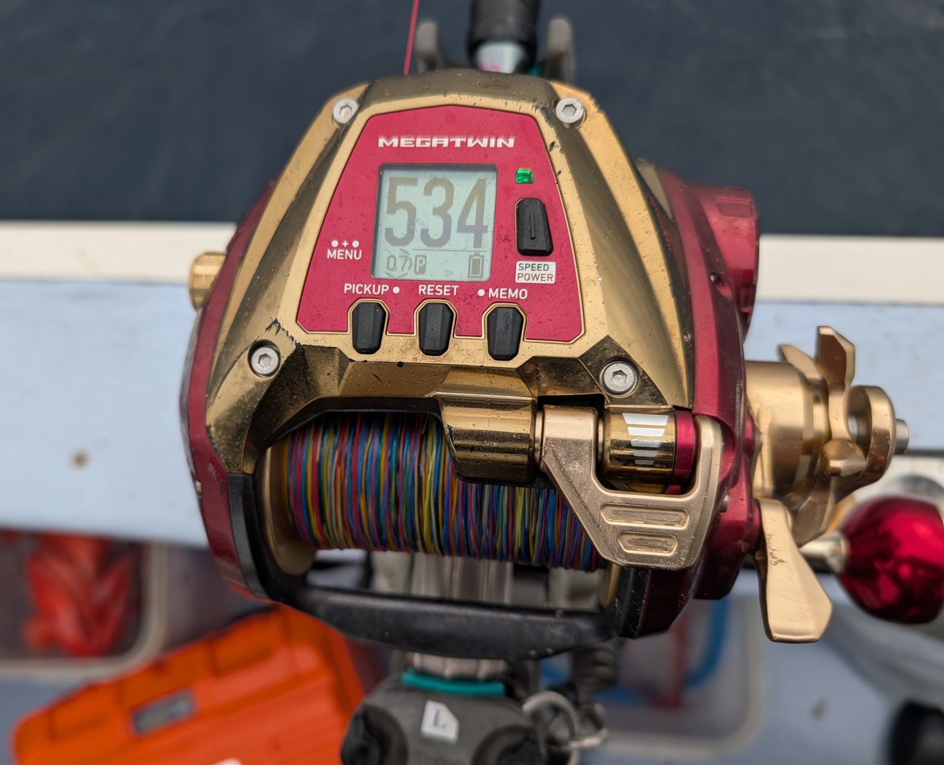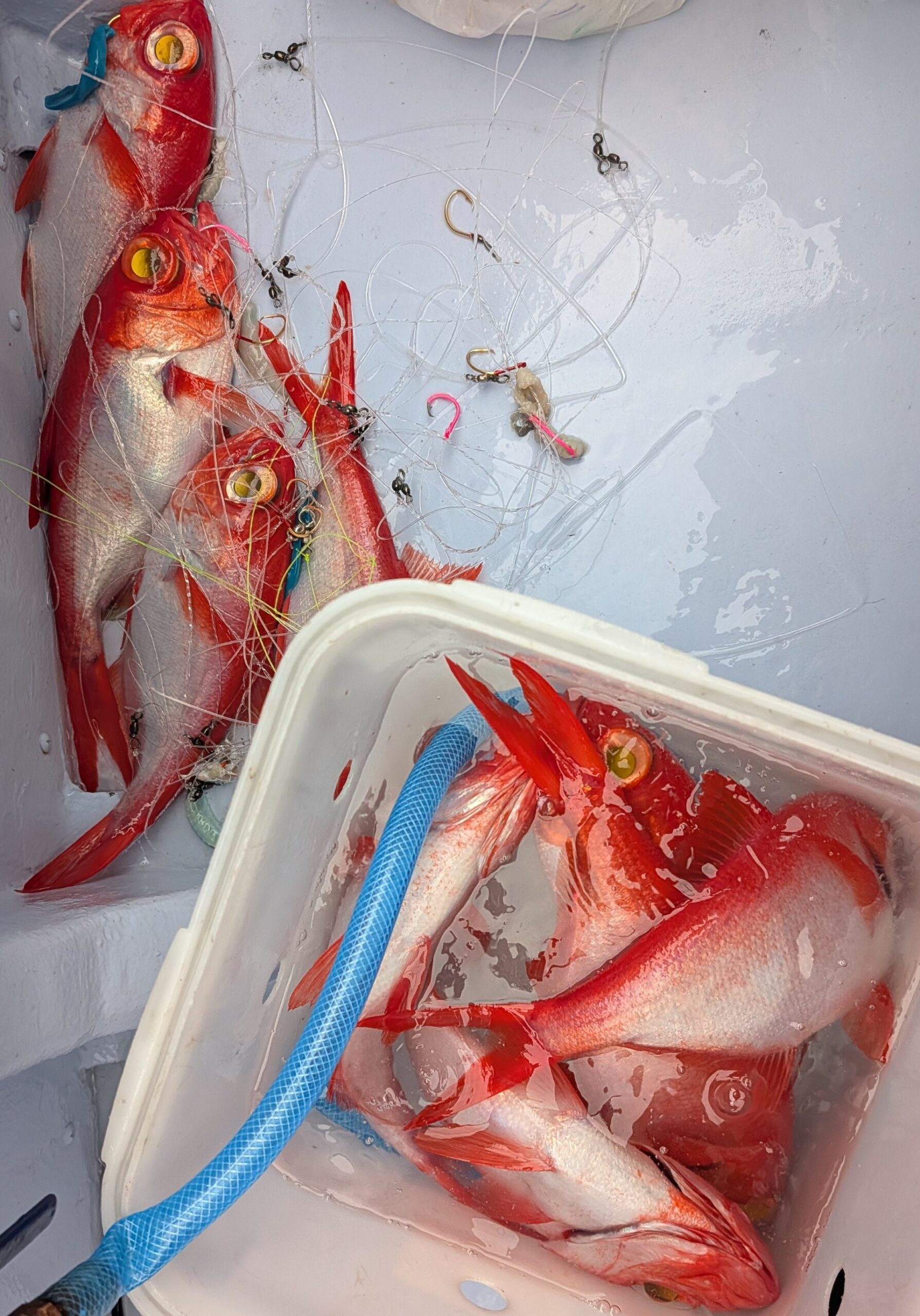 500号オモリを背負ったまま海面に提灯行列で上がってきたのは良型アコウダイの4点掛け!他にキンメも数匹付いていました。