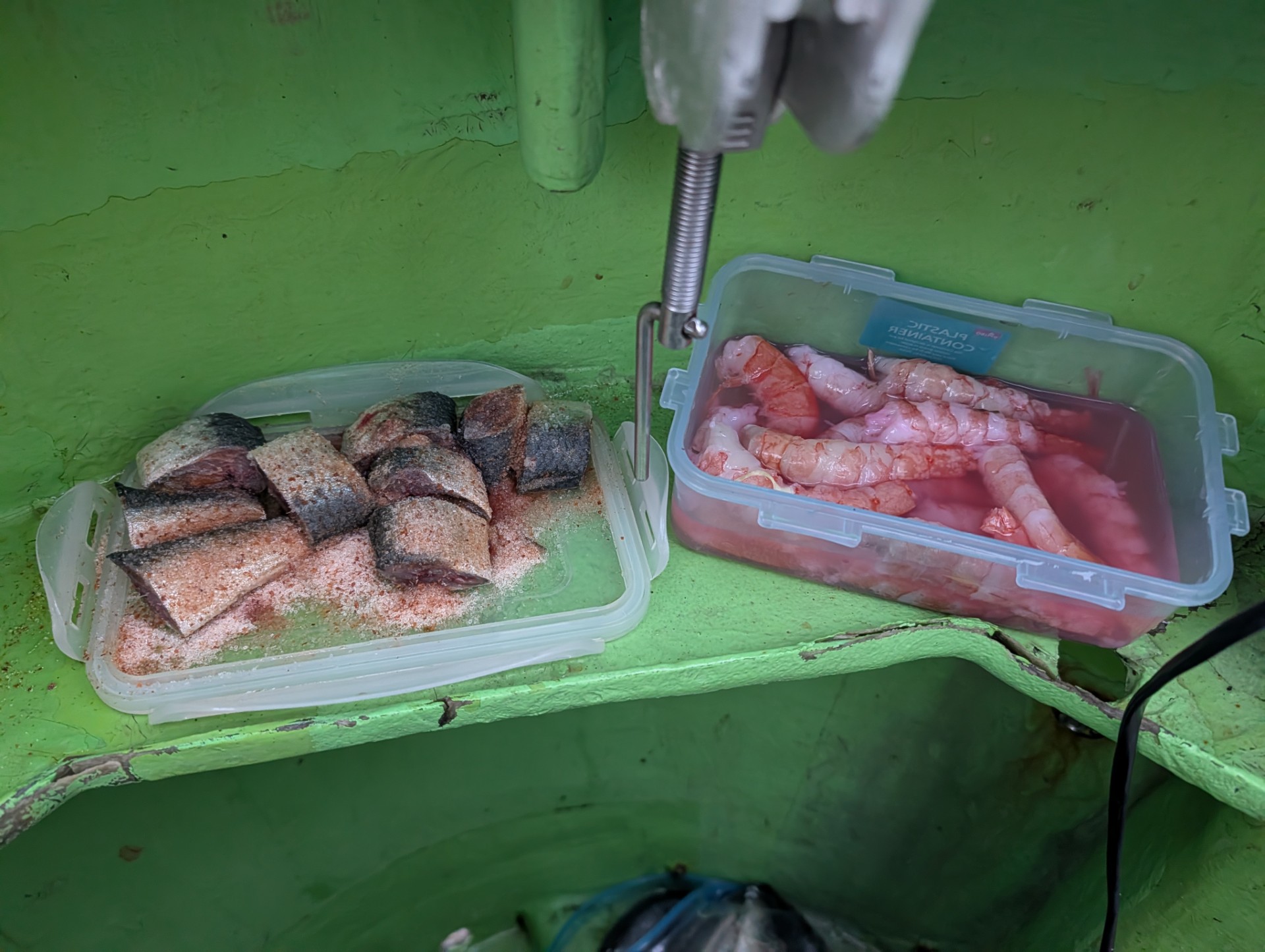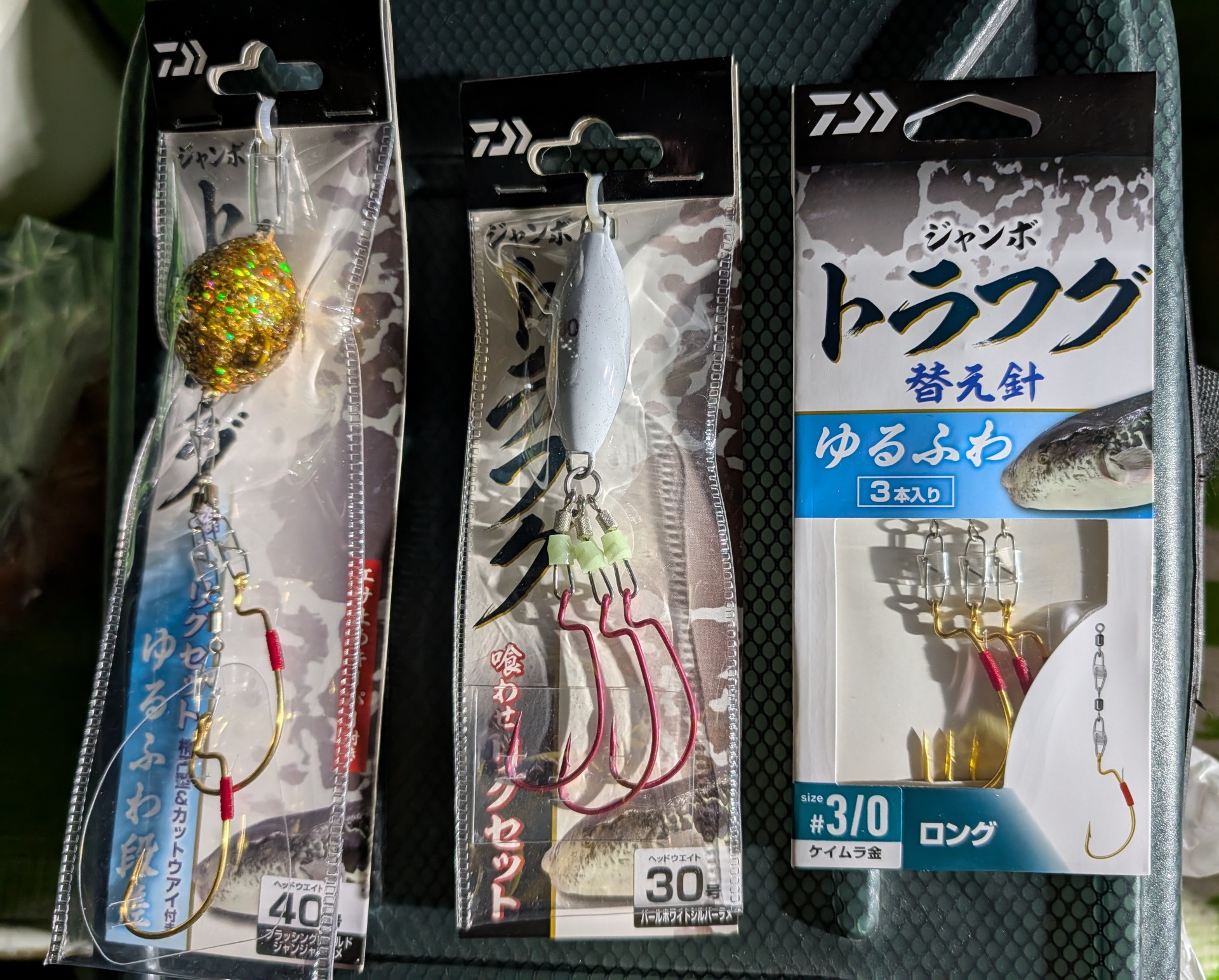ダイワのトラフグリグにエサはアルゼンチンアカエビとイワシを準備。